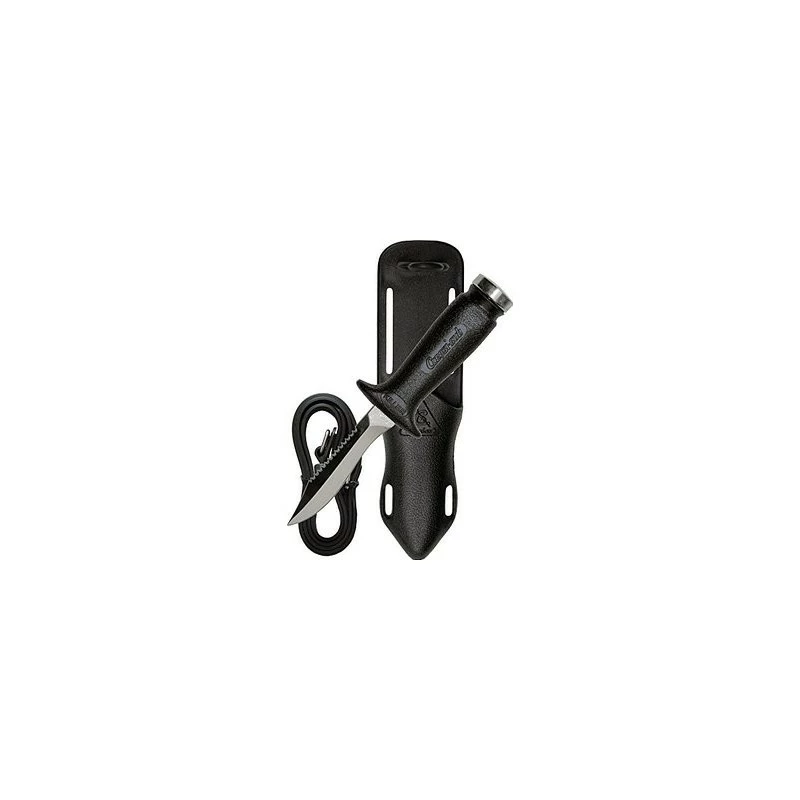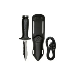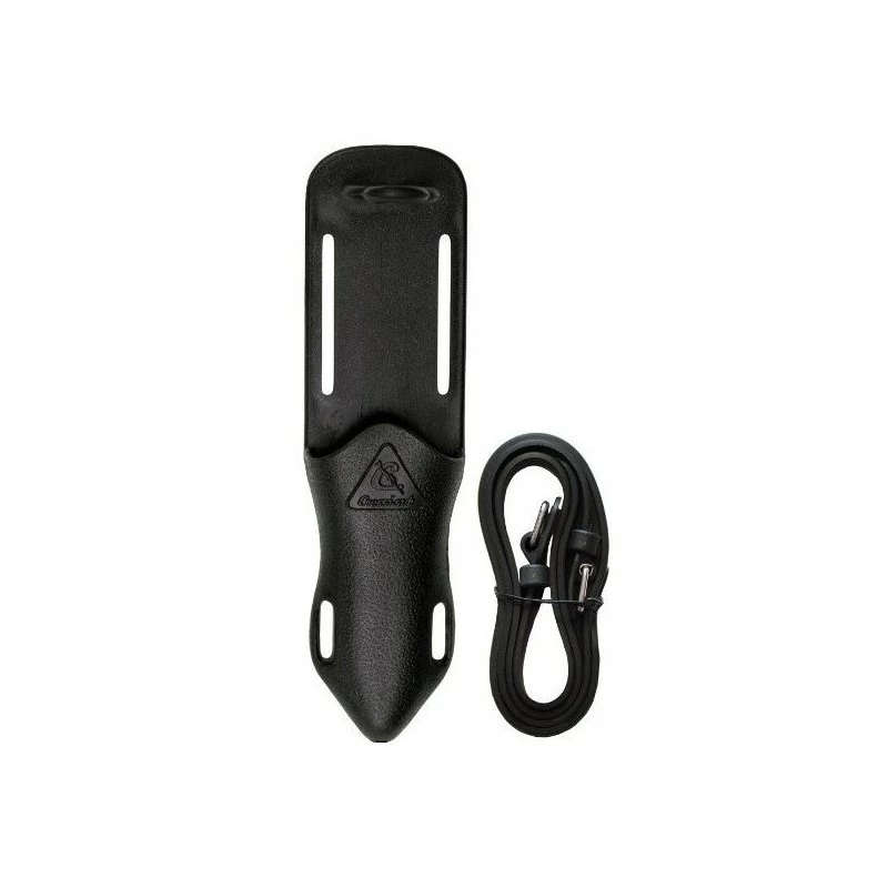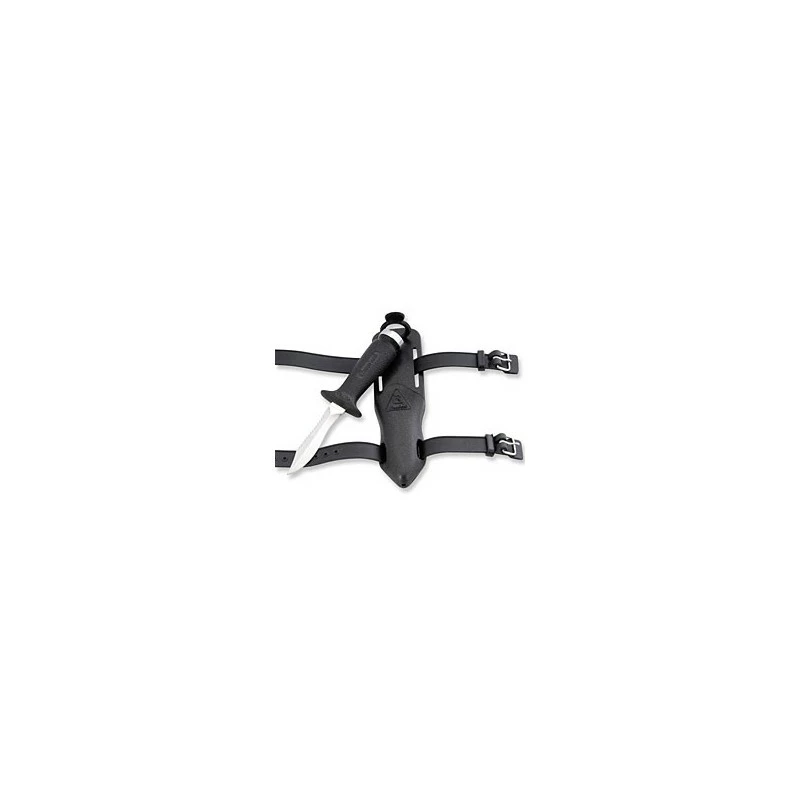 La gaine en matière plastique possède un classique anneau élastique pour maintenir le couteau & des passages pour attacher le couteau au mollet ou à la ceinture.