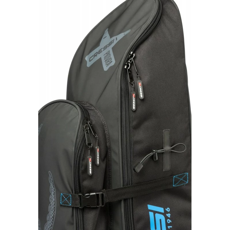 Le compartiment principal, avec un filet transpirant anti-humidité dans l’extrémité inférieure, peut accueillir des équipements de pêche pour l’apnée, comme une combinaison, des palmes longues (jusqu’à 100 cm), un masque, un embout, une ceinture, un couteau et divers accessoires.