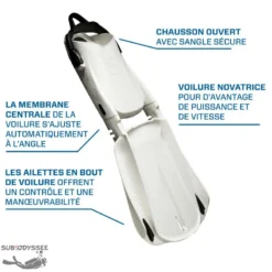 – Un chausson fermĂ© (vendu sĂ©parĂ©ment) est disponible pour la plongĂ©e en eaux plus chaudes & ne nĂ©cessitant pas le port de bottillons.