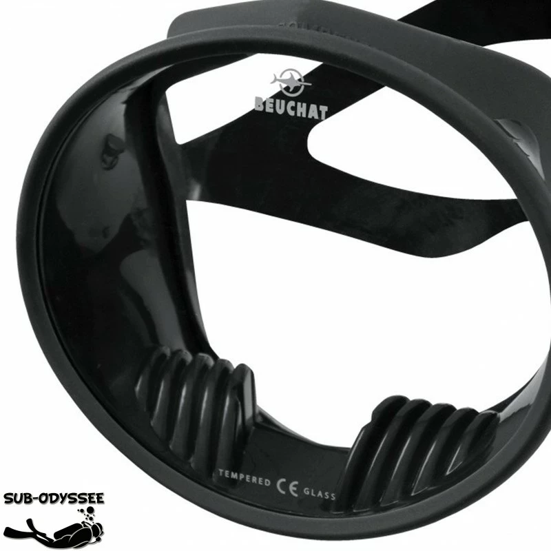 Bossages de compensation Ă soufflets (la dĂ©formation du masque ne s’applique que sur la partie nasale lors des manoeuvres de compensation & n’affecte pas l’étanchĂ©itĂ© de la jupe).