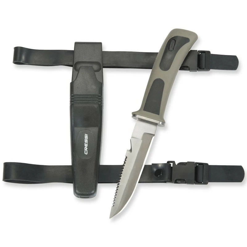 Le VIGO de Cressi est un petit couteau, plat & ergonomique, qui se met dans sa gaine & se retire facilement, & un système de retrait qui évite les pertes accidentelles, du fait que deux boutons doivent être pressés simultanément pour extraire le couteau de sa gaine.